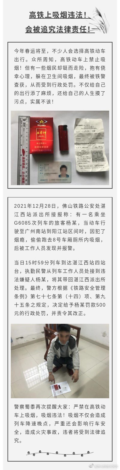 春运将至,相信不少人会选择高铁动车出行。众所周知,高铁动车上禁止吸烟!然而一些烟民却铤而走险,抱有侥幸心理,躲在卫生间吸烟。这不,12月28日,@佛山铁路公安处 湛江西站派出所就接报一名偷偷跑去厕所内吸烟的烟民。