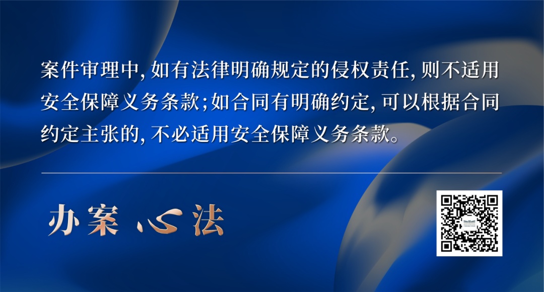 案件审理中,如果有法律明确规定的侵权责任,则不适用安全保障义务条款,比如《民法典》规定的教育机构的管理责任,公共道路管理人责任,林木所有人或管理人责任,公共场所或道路上挖掘、修缮安装地下设施致害责任,窨井等地下设施致人损害管理人责任等。如果合同有明确约定,可以根据合同约定主张的,不必适用安全保障义务条款。
