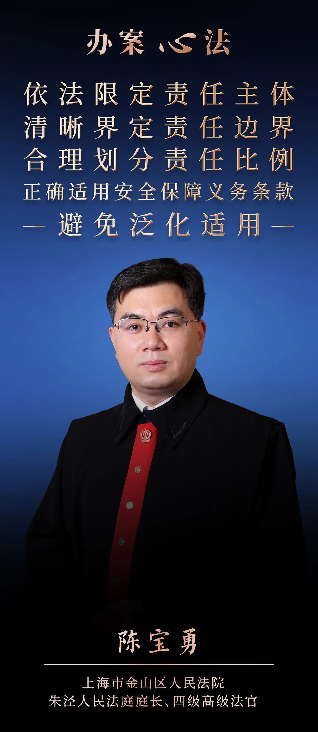 本期“办案心法”栏目“上海法院审判业务骨干”特别专题,邀请上海法院审判业务骨干,上海市金山区人民法院朱泾人民法庭庭长、四级高级法官——陈宝勇为我们讲解如何正确适用安全保障义务条款,合理划分责任比例