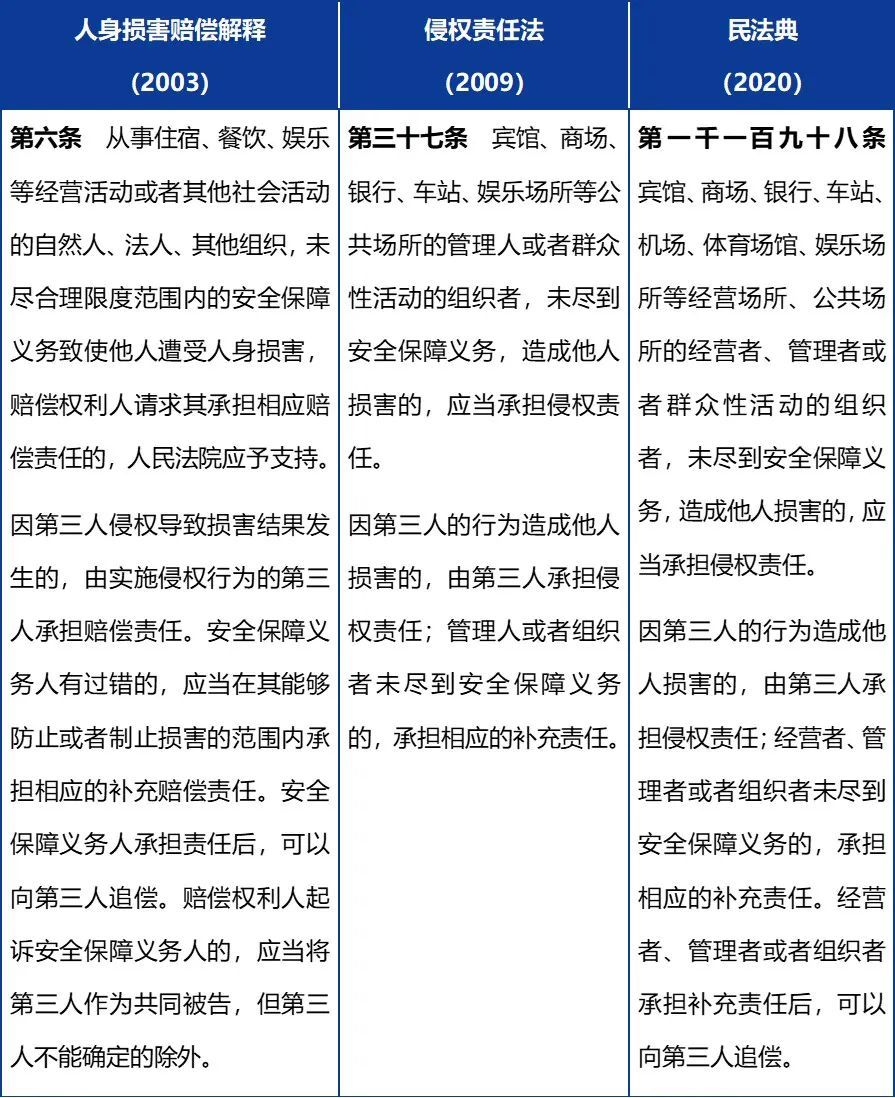 2003年12月29日,最高人民法院公布《最高人民法院关于审理人身损害赔偿案件适用法律若干问题的解释》(以下简称《人身损害赔偿解释》),该解释第6条规定了安全保障义务责任。2009年12月26日,《中华人民共和国侵权责任法》(以下简称《侵权责任法》)通过,该法在总结司法解释实施以来的实践经验基础上,以立法形式在第37条规定了安全保障义务。2020年5月28日通过的《民法典》第1198条,在对《侵权责任法》的规定进行了部分修改基础上,再次对安全保障义务侵权责任进行了规定。