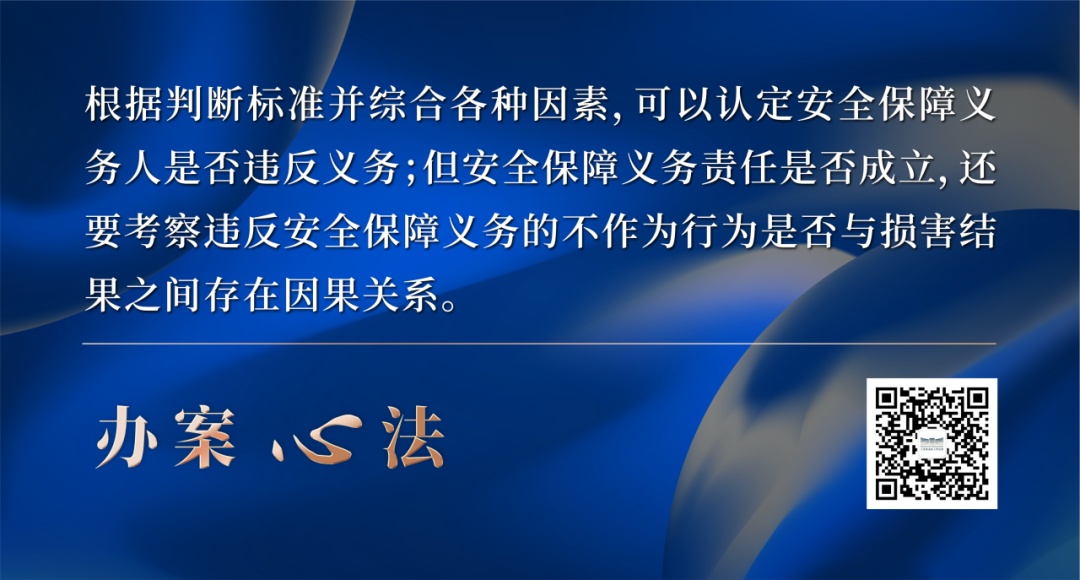 首先,从安全保障义务人角度,可以考虑法律规定、行业规范、合同约定、预防成本、预防能力等因素。根据审判实践经验,可从违反安全保障义务的类型方面作出如下判断: