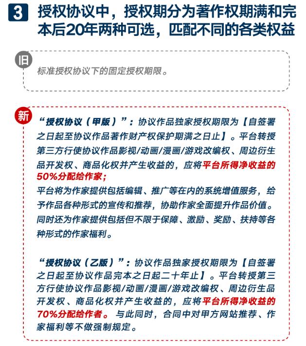 最受外界关注的,“直到作者死后50年,版权都归阅文所有”的条款被修改为两种可选:甲版(著作权完整期限,死后50年)和乙版(完本后20年)。