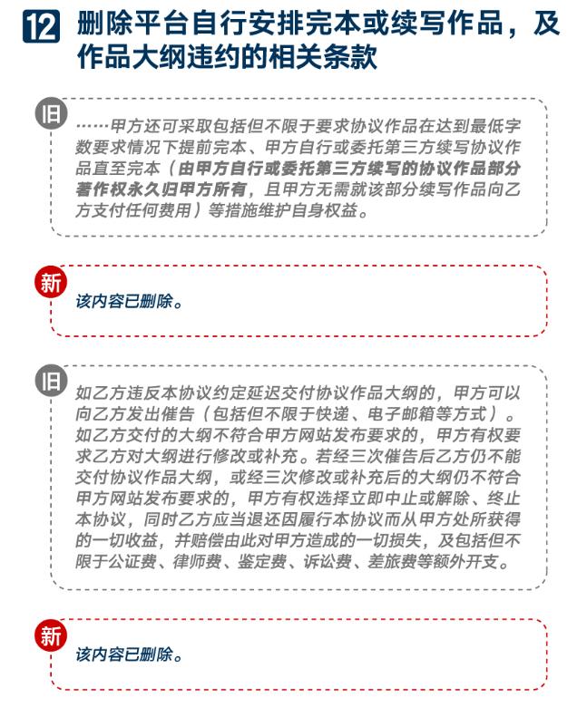 值得一提的是,优化后的新合同,进行了12项修改或删除,其中包括作品是否加入免费模式由作者确认、强调著作人身权属作者、平台与作家属合作关系并提供多种福利权益等。