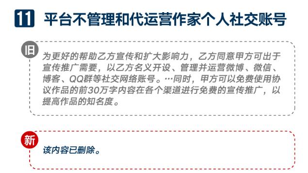 令人欣喜的是,此前让不少网文作家无奈的,“连自己的社交账号也要被平台拿走使用”的行业痼疾,已在新合同中被删除。