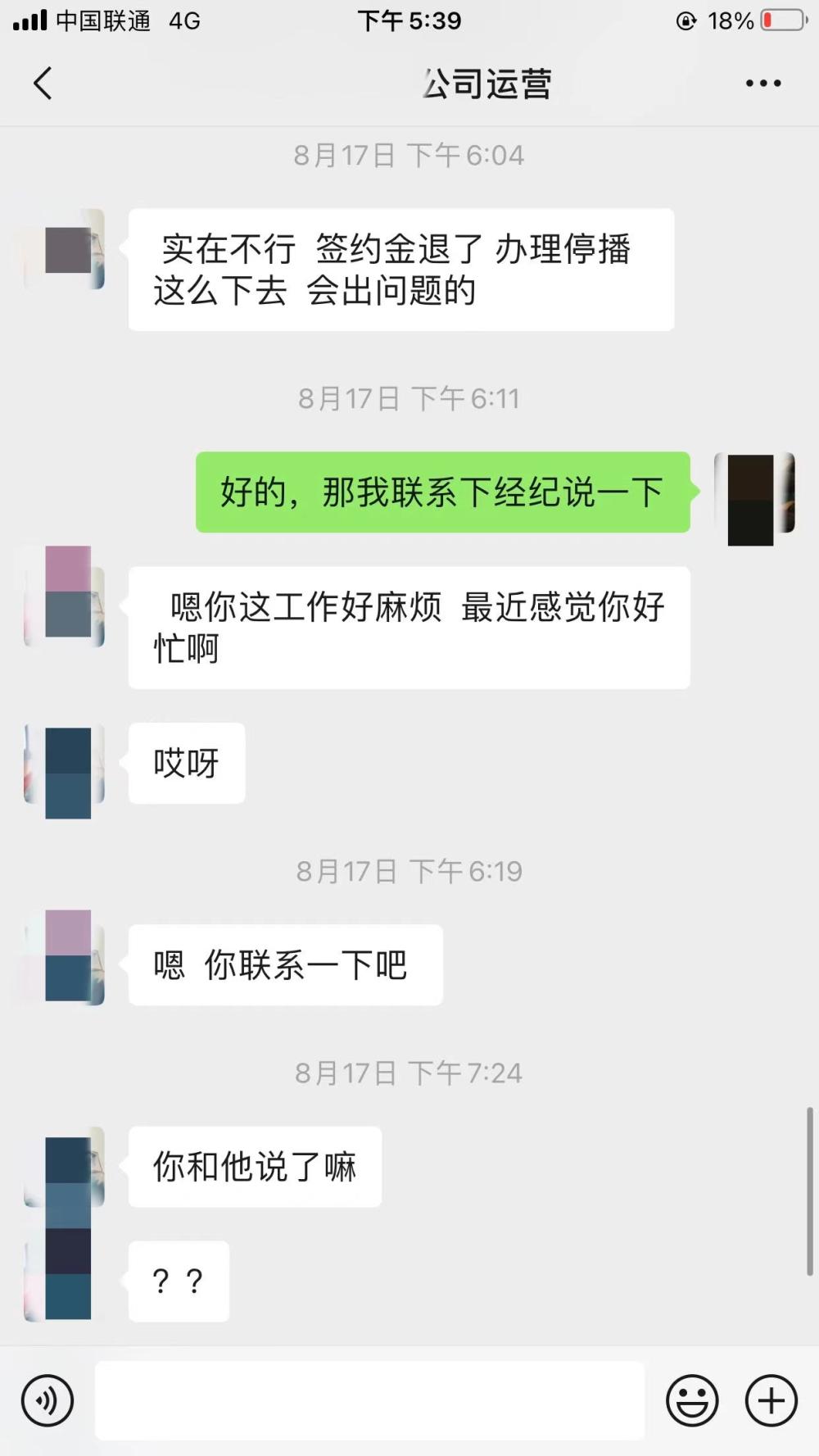 在她的录音中,双方对是否签署解约协议一事再次发生分歧。负责人强调,“真有事情不播了,都是提前把签约金退掉,就没事了,也没有牵扯什么停播协议解除协议。”