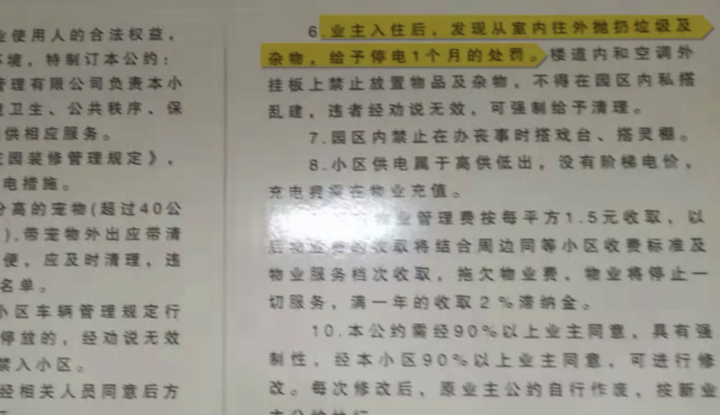 据业主规约显示,业主入住后,被发现从室内往外扔垃圾及杂物,给予停电一个月的处罚;如果业主违反该小区装修管理规定,经劝说无效,可采取停电措施。王虹介绍,停电一个月一般按30天算,这是业主规约中最严厉的处罚。“我们没有执法权,不能罚款,希望以此对高空抛物行为给予警告,我们不希望这种行为危害公共安全。但如果高空抛物造成严重后果,比如有人员伤亡或比较严重的财产损失,除了断电一个月,我们也会选择报警处理。”