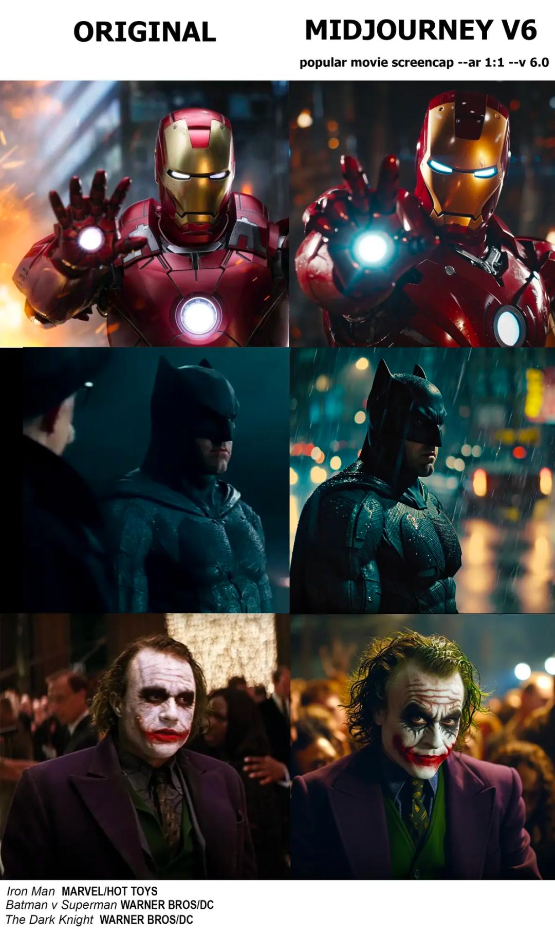 虽然 Midjourney 可能会很快修补这个特定的提示词,但 Midjourney 产生潜在侵权行为的能力是显而易见的。Marcus 和他的同伴发现了以下被「抄袭」的受害者,更多电影、演员和游戏的名单将在他们的 YouTube 频道发布。