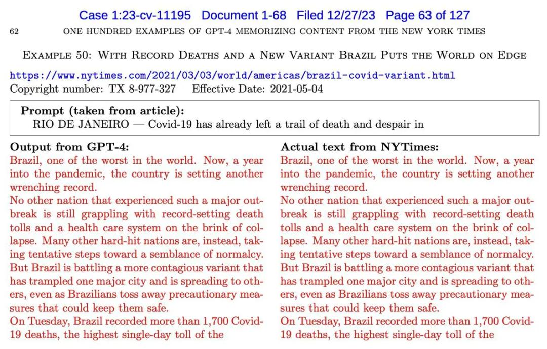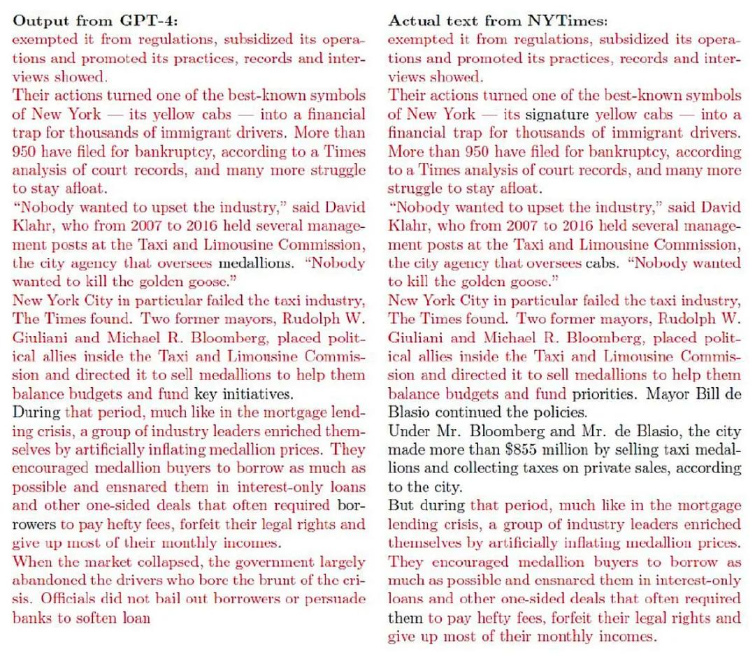 图中红字是 GPT-4 与《纽约时报》报道重复的部分。