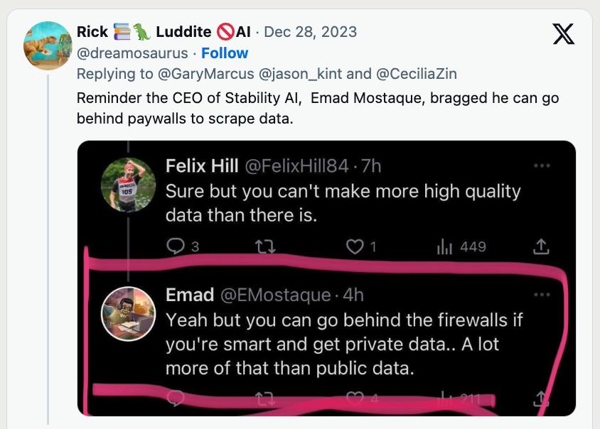 更糟糕的是,Marcus 发现有证据表明 Midjourney 的一名高级软件工程师在 2022 年 2 月参与了一场关于如何通过「通过微调代码」来「洗白」数据以逃避版权法的对话。