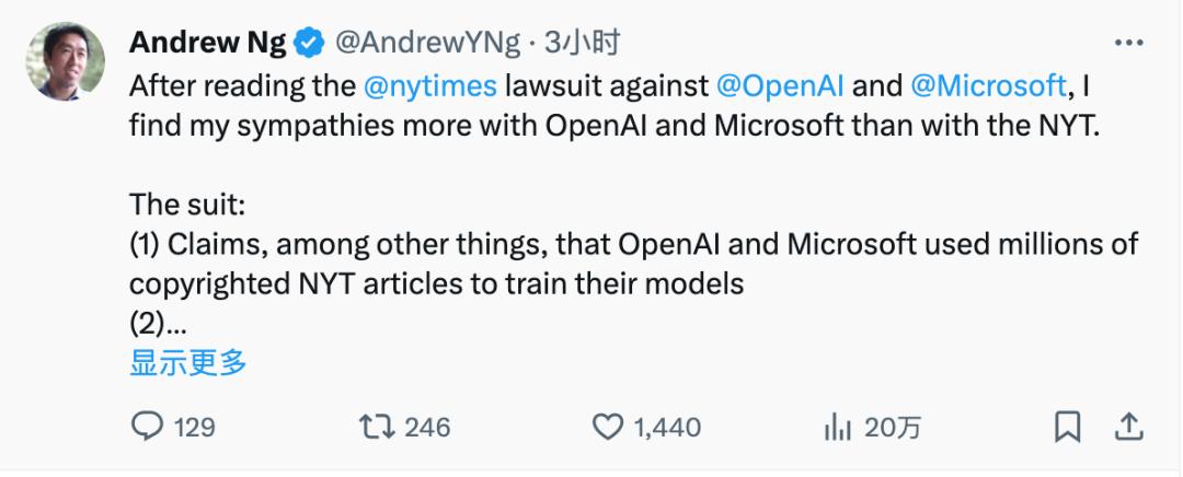 机器学习领域权威学者吴恩达对 OpenAI 和微软表示了同情,他怀疑 GPT「存在抄袭」的原因并不只是模型训练集使用了未经授权的文章,而是来自类似于 RAG(检索增强生成)的机制。ChatGPT 浏览网络以搜索相关信息,并下载了一篇文章来回答用户的问题。他发现,没有 RAG 类似机制的 LLM,在预训练中的输出通常是对输入的转换,几乎从未逐字逐句地「抄袭」。