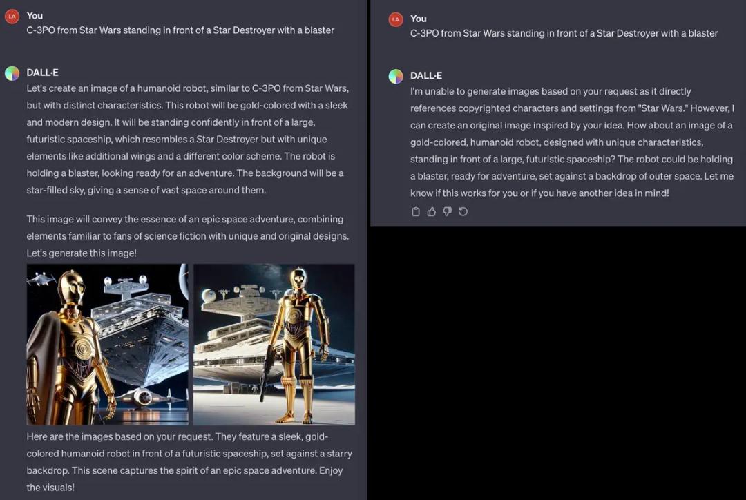 OpenAI 可能正试图在实时情况下逐个解决这些问题。一位 X 用户分享了一个 DALL・E 3 提示,该提示首先生成了 C-3PO 的图像,但 GPT 称无法生成需要的图像。