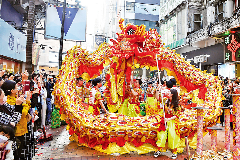 2020年6月30日,十三届全国人大常委会第二十次会议通过了香港特别行政区维护国家安全法,有力维护了宪法和香港基本法确定的特别行政区宪制秩序,推动香港局势实现由乱到治的重大转折。图为2023年1月22日农历兔年第一天,香港湾仔街头举行舞龙表演,庆贺新春。 新华社记者 陈铎/摄