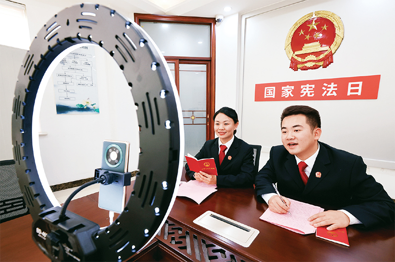 2022年12月4日是第九个“国家宪法日”,山东省枣庄市市中区人民法院开展了以“学习宣传贯彻党的二十大精神,推动全面贯彻实施宪法”为主题的宣传活动。图为12月3日,市中区人民法院的两名法官通过网络直播方式向观众宣传宪法知识。 人民图片 孙中喆/摄