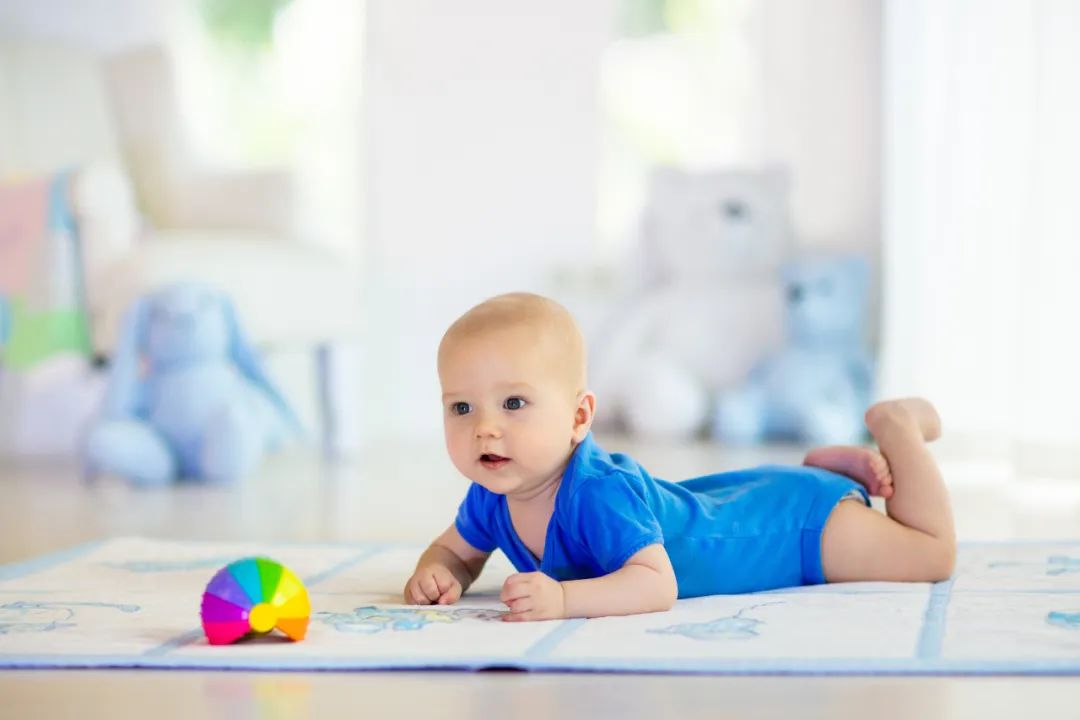 5.对于匍匐前进的娃,我们用个被单帮助宝宝腹部抬起,分担宝宝自己无法承受的重量,等待宝宝四肢肌肉强壮了,就能自己支撑身体重量了。