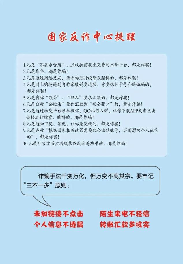 虽然骗子的诈骗手法层出不穷,但是只要我们牢记“8个凡是”和“六个一律”,坚持不轻信、不汇款、不透露、不扫码、不点击链接、不接听转接电话,就可以保住我们的“钱袋子”。
