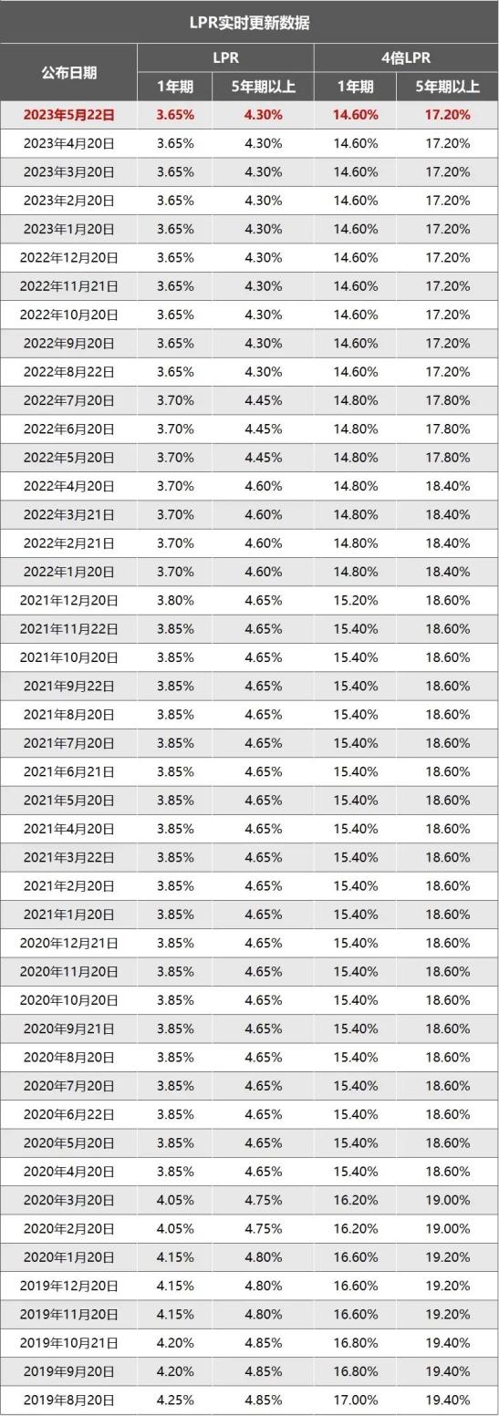2023年6月20日,中国人民银行授权全国银行间同业拆借中心公布,贷款市场报价利率(LPR)为:1年期LPR为3.55%,5年期以上LPR为4.2%。这是LPR自2022年8月以来首次下调。