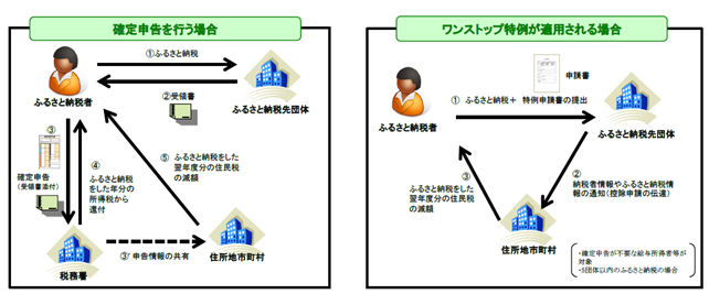 ふるさと納税として寄附された金額について、控除を受けるためには、ふるさと納税を行った年分において確定申告をする必要がありますが、平成27年4月1日以後に都道府県・市区町村に対する寄附(ふるさと納税)を行った場合で、かつ、確定申告が不要な給与所得者の方については、ふるさと納税先が5団体以内の場合に限り、ふるさと納税先団体に申請することにより確定申告をしなくても、この寄附金控除を受けることができます。この制度を「ふるさと納税ワンストップ特例制度」(注1)といいます。