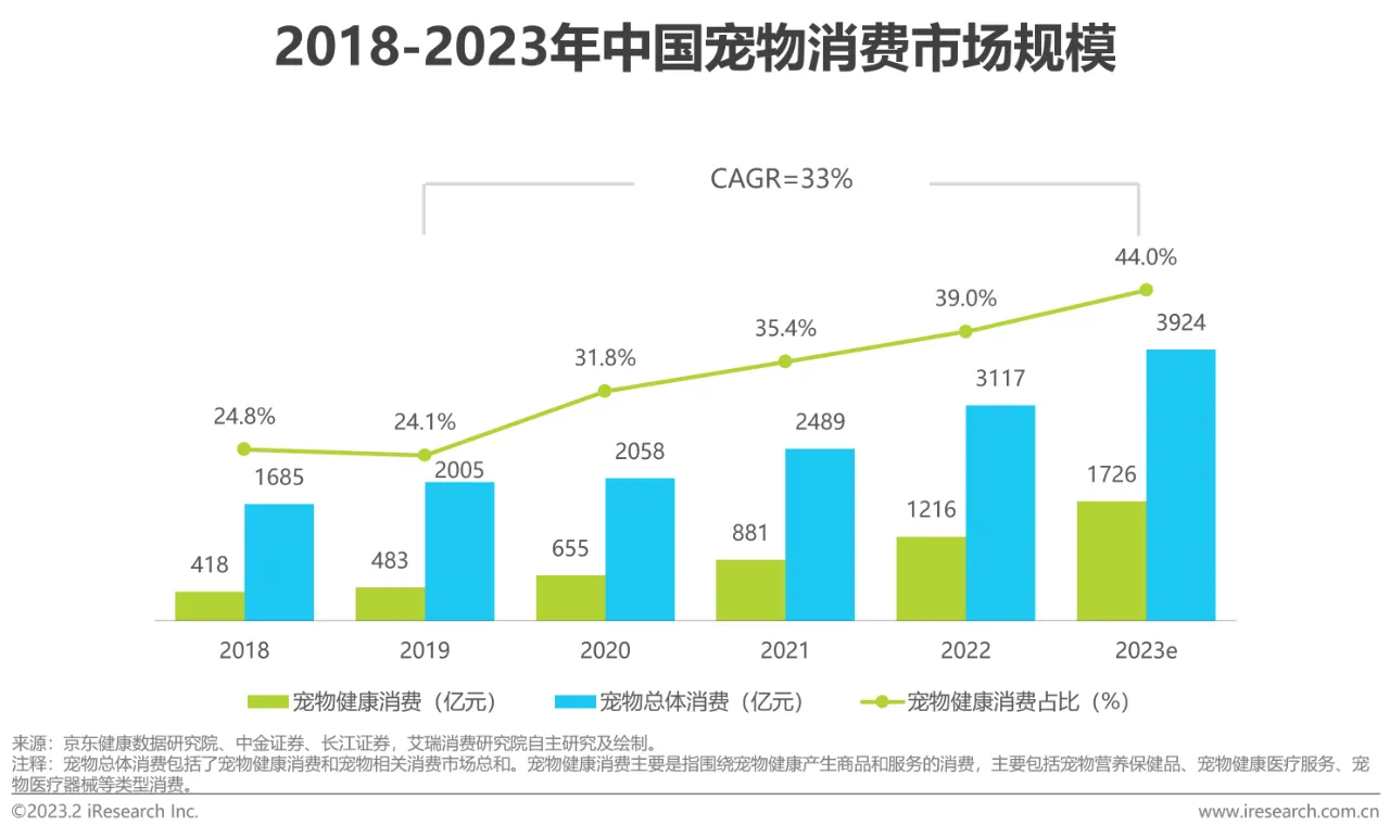 艾瑞咨询预计,随着宠物家庭渗透率和行业成熟度持续提升,宠物消费市场未来依然会保持增长态势,预计2023年市场规模约为3924亿元,2019年-2023年复合增长率可达33%。