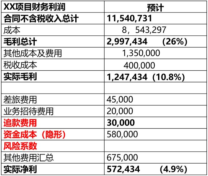 正向具体计算金额不必追求精准,采用逆推法可以更简单。公司的采购成本+直接人工成本+运营管理成本,直接乘以盈利系数,简单的判定此合同是否合适。将合同审核看作一个具体的项目管理,用现金流口径和损益口径分别看待审核~