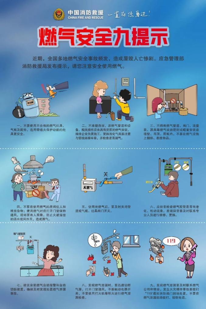 九、遇到任何燃气安全事故,要迅速远离危险位置,联系燃气公司和物业,严重的拨打“119”电话报警求助。