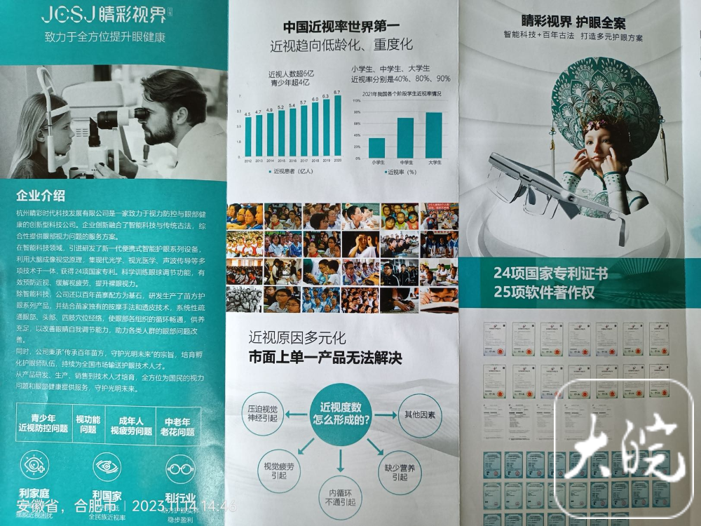 当事人经营现场广告彩页、《品牌介绍手册》和《资质手册》中均有“专利证书”介绍,并分别展示有14份专利证书、5份专利申请通知书。该经营户经营场所悬挂有三张“百年护眼专业+古法穴位技术”“通过独特的苗方产品热敷,配合苗家独有的按摩手法和透皮技术”等功效介绍;发放的“社保公益卡”和“价值198元体验券”上印刷有“最终解释权归晴彩视界省医店”、“最终解释权归晴彩视界总部所有”的条款。