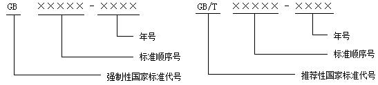 强制性国家标准的编号由强制性国家标准代号(GB)、顺序号和年代号构成。强制性国家标准的代号为“GB”,表示“国标”;推荐性国家标准的代号为“GB/T”,表示“国标/推”。国家标准的编号由国家标准的代号、国家标准发布的顺序号和国家标准发布的年号构成。示例: