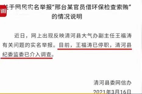 82.河北官方通报官员借环保检查索贿:目前王福涛已停职,县纪委监委已介入调查。(青蕉视频)