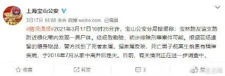 107.上海警方通报绿化带内发现男尸,据家属反映,死亡男子倪某生前患有精神疾病,于2018年7月离家走失。目前,有关情况正在进一步调查中。(正义网)