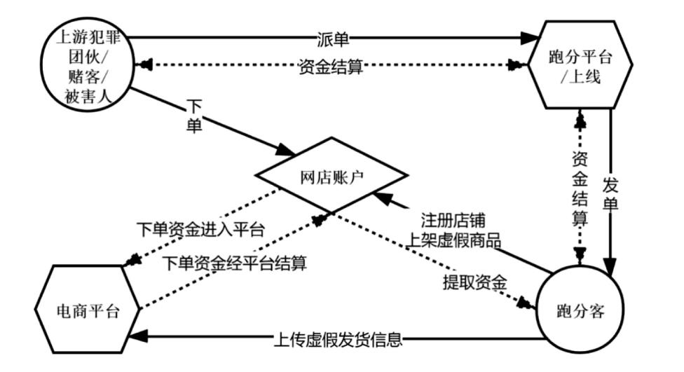 与资金池型跑分活动相比,电商交易型跑分有以下特点。第一,电商交易式跑分调用合法运营的电商平台所形成的接口和数据,而电商平台往往属于具备经营资格的第三方支付平台,同时能与其他第三方支付进行资金流通。第二,由于电商交易型跑分活动对于独立跑分平台的需求有限,跑分团队往往采用网络群聊的方式进行联络,层级分布更为明显,跑分客直接将押金提交给“领导”,无法如资金池型跑分平台一般以平台为中心形成庞大的资金池。第三,电商交易型跑分中,跑分客通过虚假发货伪造交易,以虚假交易掩饰资金的流动的非法性。