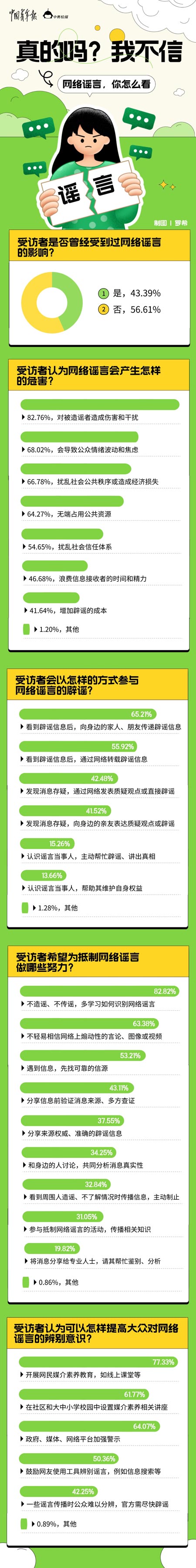 每位网民不仅是信息的接收者,也是信息传播的参与者。“信息转发和传播的便捷,让信息能够非常容易地在网络中流通,谣言也是如此。因此看到自己不能确定的信息,首先不要去贸然转发和定论,因为一个随手的转发、评论,就有可能成为谣言传播的一条途径,所以大家要从我做起避免谣言的扩散。在此基础上,作一些批判性的思考,告别信息‘拿来主义’,对相关事件经过详尽了解、分析后,慢慢地形成自己的判断,甚至可以通过对事件的了解和分析,借助媒体或网络平台提供的渠道反馈或举报,阻止谣言进一步产生负面影响。”蒋俏蕾说。