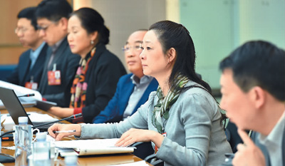 3月7日,宪法修正案草案小组讨论会上,侨联界别组委员刘以勤(右二)在认真听取发言。