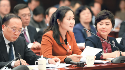 3月7日,在山西代表团的讨论会上,全国人大代表、太原市市政公共设施管理处水道养护工王润梅(中)以一名基层劳动者的切身感受,表达了人民群众对修改宪法的衷心拥护。