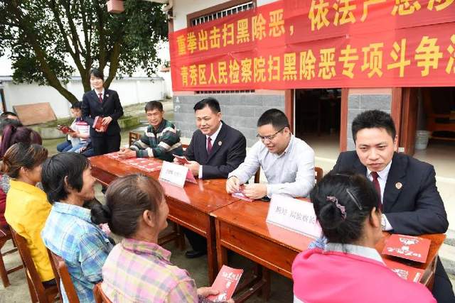 广西壮族自治区南宁市青秀区检察院干警深入社区开展扫黑除恶专项斗争普法宣传。