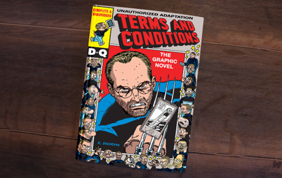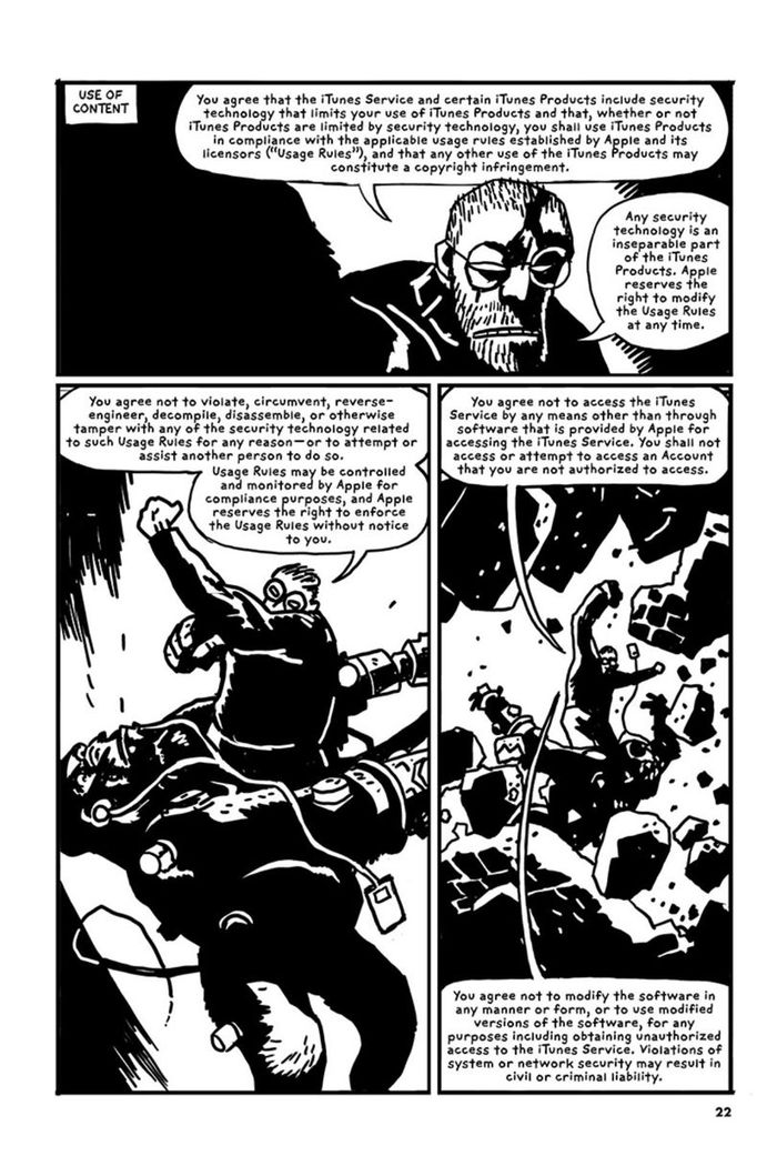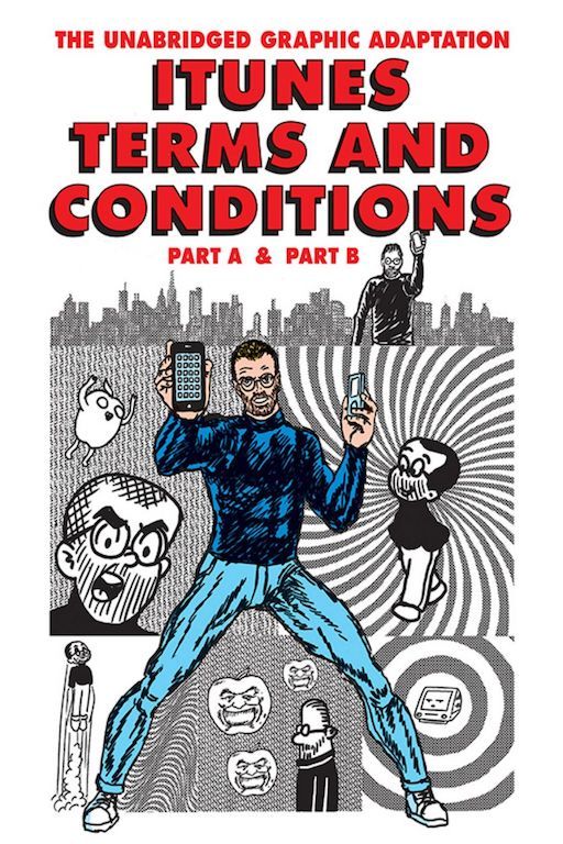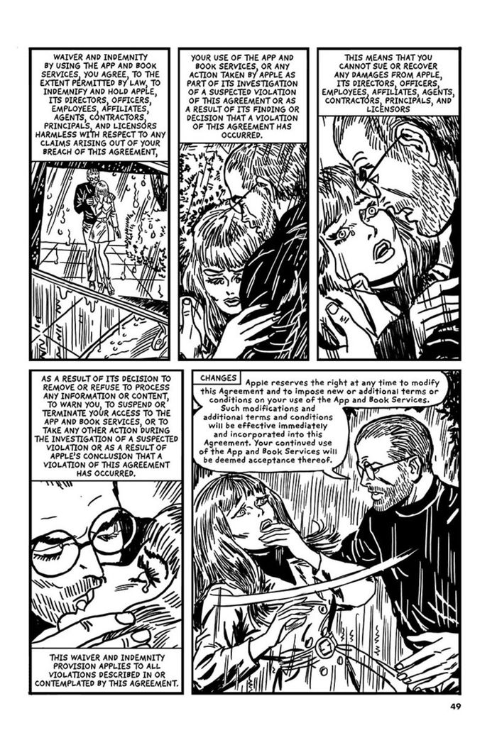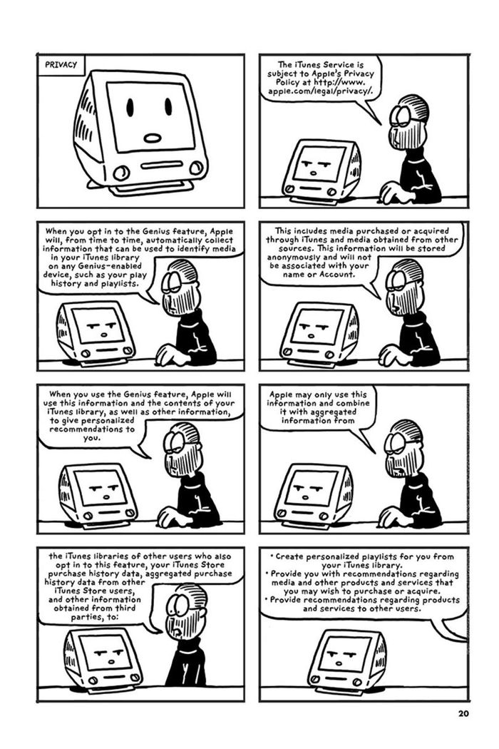 “我在以前的作品中也会把一些大家熟知,但是却没有完全读过的文学作品人物,通过漫画的方式诚呈现出来,”Sikoryak说,“而这次当我想做一个长篇系列时,我想到了苹果公司的服务条款,它或许可以创作出一个非常独特的漫画,而且每个人都知道它,却可能没有人真的读过它。”