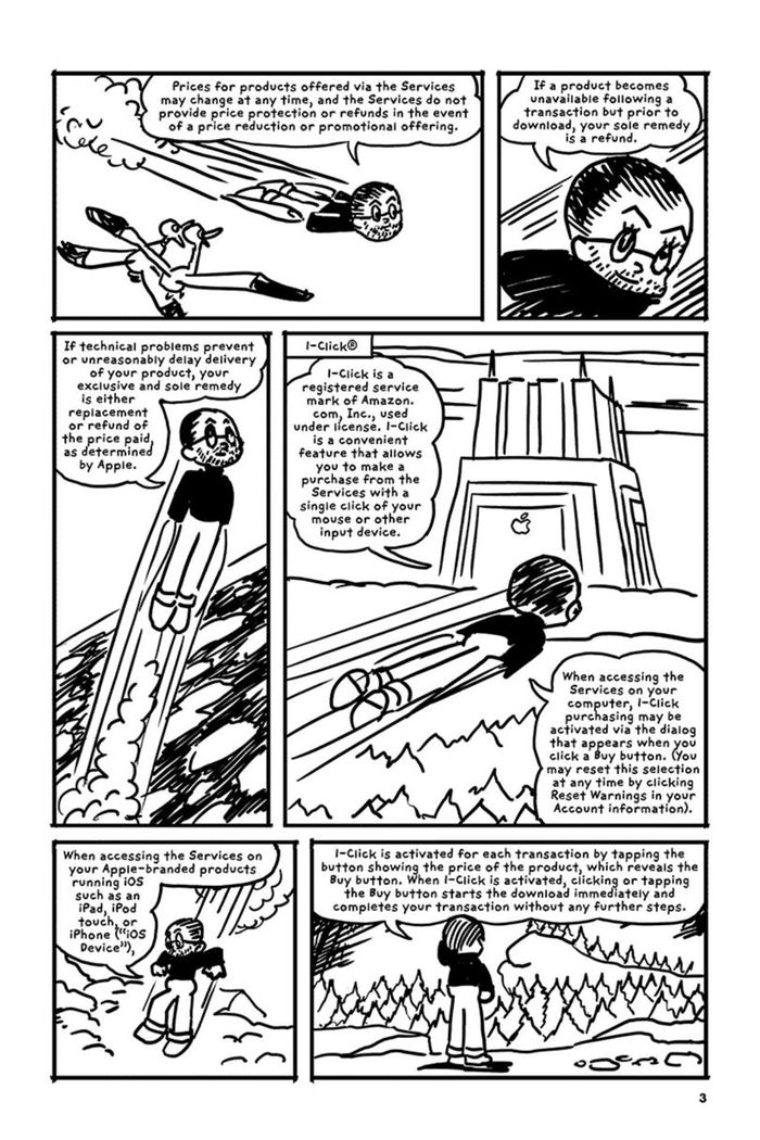 不过一个叫Robert Sikoryak的漫画家从2015年开始,换了一种方式让人们阅读 iTunes服务的法律条文——漫画。已故的苹果公司创始人乔布斯是这个系列的漫画主角,Sikoryak当然也没有忘记他经典的黑色高领毛衣、牛仔裤、眼睛及络腮胡。
