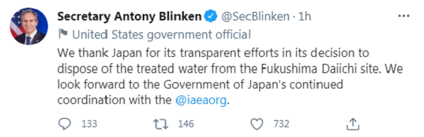 没错,面对日本这种极端不负责、极端短视的行为,西方媒体态度模糊,甚至集体沉默,美国政府更是习惯性地玩起了“双标”。4月13日,美国国务院回应称支持日本政府的决定,并表示该做法符合全球公认的核安全标准。更令人瞠目结舌的是美国国务卿布林肯的回应,布林肯表示“感谢日本方面在决定处理福岛第一核电站核废水问题上做出的透明努力,期待日本当局继续与国际原子能机构进行协调”。此言一出,舆论哗然,有网友说,布林肯身体力行地诠释了什么是黑白颠倒、是非不分。一南教授,您如何看待美国在日本核废水处置问题上的表态?
