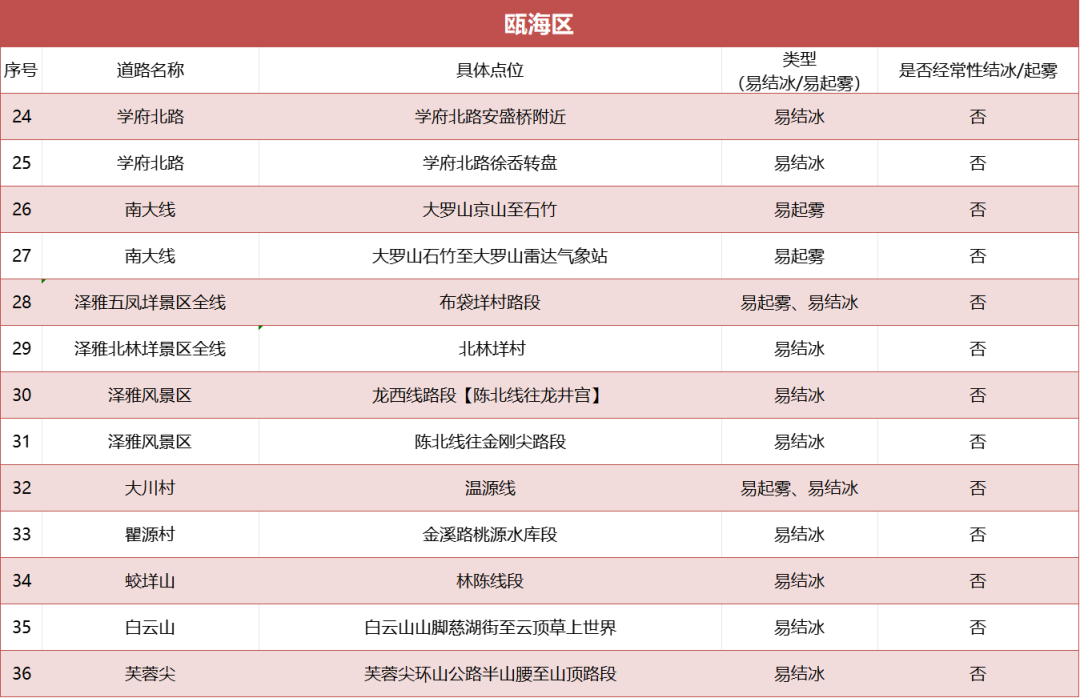 温州公安交警通过隐患排查梳理出易结冰、易起雾路段,驾驶员朋友们经过以下路段时请务必小心驾驶。