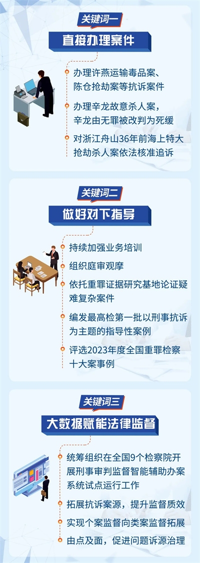 不单单是直接办理许燕运输毒品案,过去一年,第二检察厅全身心聚焦监督办案这一主责主业,坚持不枉不纵、有错必纠,依法办理了陈仓抢劫案等抗诉案件,陈仓从无罪被改判为死缓。坚持用心用情办好申诉案件,对被害人亲属申诉的辛龙故意杀人案向最高人民法院提出抗诉后被指令再审,辛龙由无罪被改判为死缓。严格审查把关核准追诉案件,对浙江舟山一起36年前的海上特大抢劫杀人案,依法决定核准追诉,两名被告人均被判处死刑。