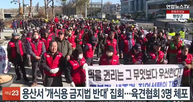 2023年11月,韩国肉犬养殖者协会约200人在总统府前抗议立法禁食狗肉 图源:韩媒