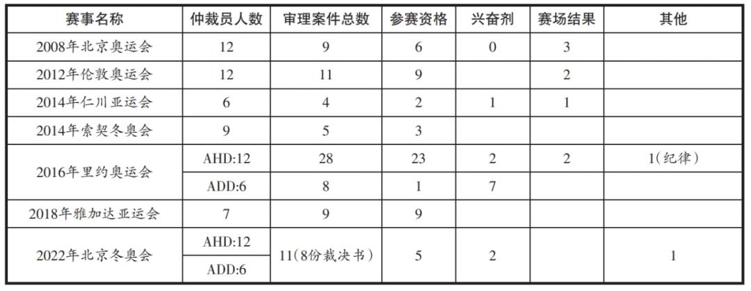 根据CAS官网公布的数据,截至2022年北京冬奥会结束,一共有161个奥运会赛事争议提交了仲裁。这个数据在CAS仲裁庭的总争议解决数量(9695件)的占比很少,但是AHD只受理与奥运会有关的争议,并且只是在奥运会开幕前10天至奥运会结束这段特殊时间内运行,CAS在奥运会上设立的临时仲裁机构仍然在处理国际体育争议中占重要地位。这也表明CAS临时仲裁机构的设置已经被体育行业业内人士逐渐认可并信任。