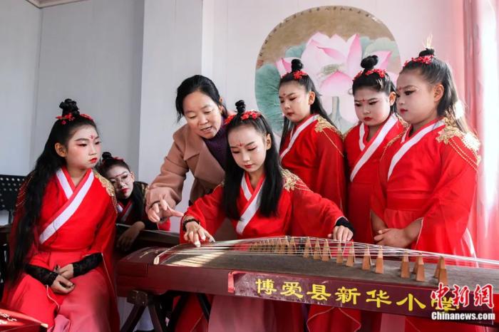 2023年11月,河南焦作,小学古筝社团的老师在指导学生弹奏古筝。程全 摄