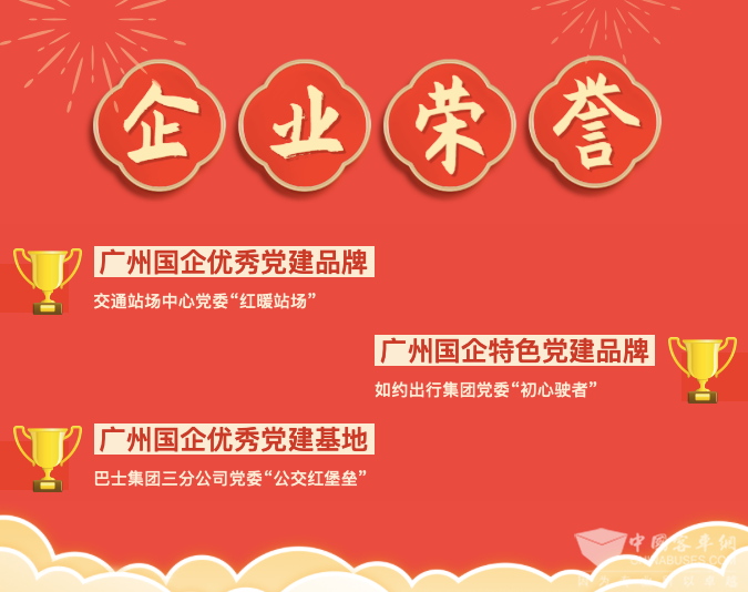 近日,广州市国资委党委主办的“党建引领·品牌铸魂”第二届广州国企党建品牌、党建阵地评选结果公布,广州公交集团属下交通站场中心党委“红暖站场”被评为“广州国企优秀党建品牌”、如约出行集团党委“初心驶者”被评为“广州国企特色党建品牌”、巴士集团三分公司党委的“公交红堡垒”被评为“广州国企优秀党建基地”。