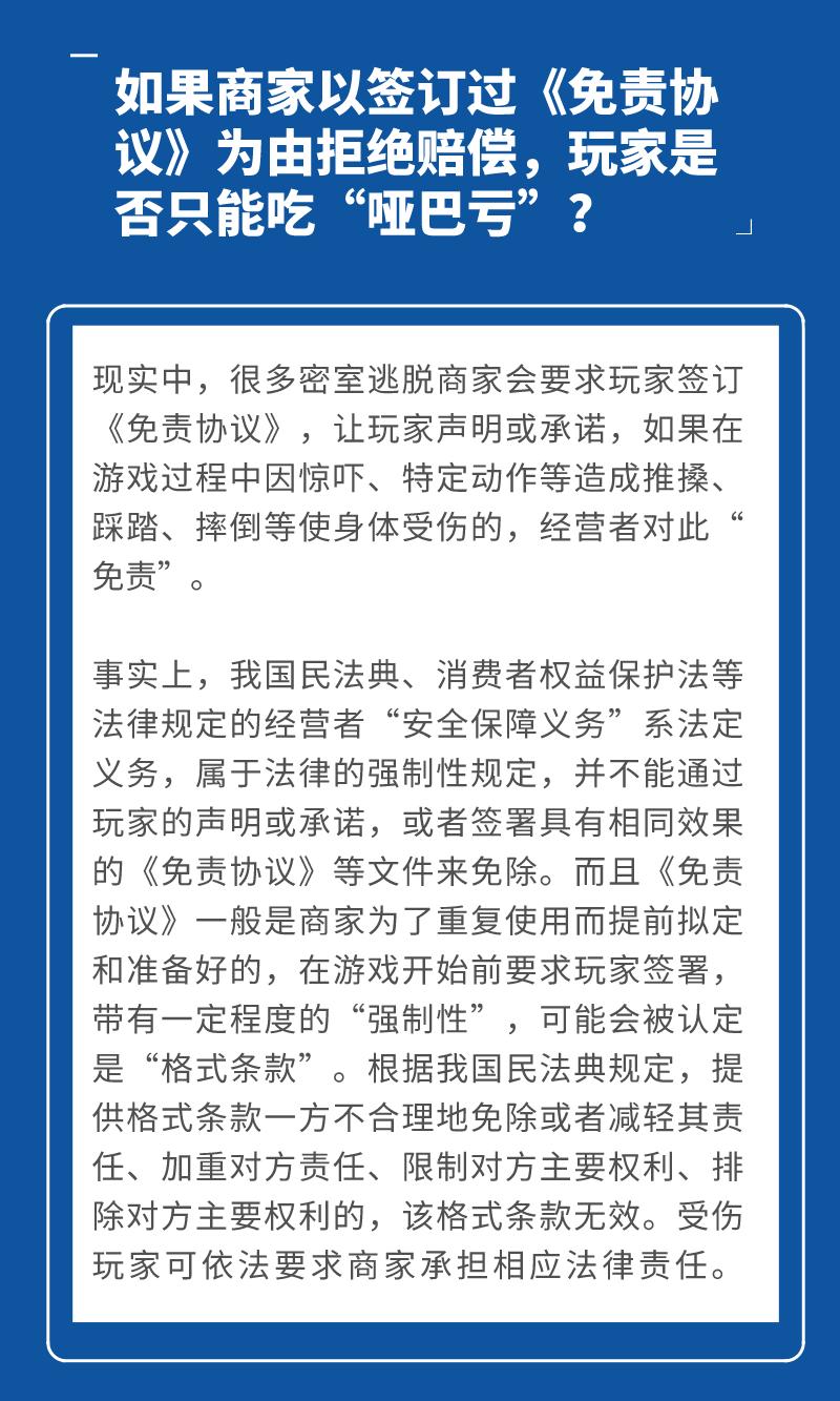 在选择体验馆和游戏主题时,不要盲目跟风,务必选择资质齐全、安全提示详细的正规商家,在看清相关介绍、安全提示,查看店家的道具设施设置情况、消防设施、疏散路线、求救方式等,充分评估综合状况后参加游戏。同时,在游戏中也不可实施可能损害他人的行为。
