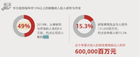 华为2019年全年营收8588亿元人民币,同比增长19.1%;净利润627亿元人民币,同比增长5.6%。经营活动现金流914亿元,同比增长22.4%。靓丽的业绩与持续的研发投入分不开,华为2019年的研发投入达1317亿元,占全年销售收入15.3%,同比增长29.7%,近十年累计投入研发费用超过6000亿元。