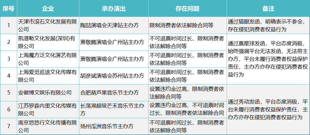 经研判,文娱演出市场问题涉及票务平台、平台内主办方或经营者几类主体,为取得“标本兼治”的实际约谈效果,省消保委要求票务平台协助消保委约谈相关主办方,大麦、猫眼、票牛按要求协助消保委约请相关主办方参加约谈会,票星球、秀动态度消极推脱,拒绝协助消保委向相关主办方及经营者发函。另外,天津市滚石文化发展有限公司、凯潽勒文化发展(深圳)有限公司、上海魔方泛文化演艺有限公司、上海爱觅巡途文化传媒有限公司、安徽博文娱乐有限公司、江苏罗森内里文化传媒有限公司、南京悠悠行文化传播有限公司等企业未参会。