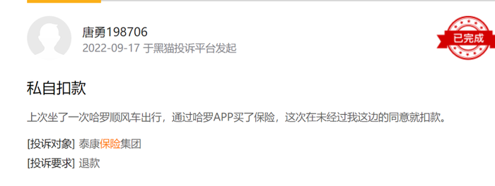 01 保险业务:与泰康在线合作,宣传“免费领取”,默认自动续费因出行与保险业务的天然契合性,加上海量用户信息,哈啰布局保险业务顺利成章,也一直瞄准相关牌照。2022年5月,哈啰出行旗下的上海钧丰网络科技有限公司(以下简称“上海钧丰网络”)终于出资5000万元,从张娅、成都赛玛赫通用航空服务有限公司手中取得了四川亿安保险经纪有限公司全部股权。但意外的是,半年后的11月,上海钧丰网络又匆匆退出投资,到手的保险经纪牌照又落空。