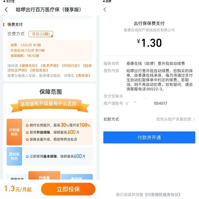 但在选择投保之后,又显示笔者的保费是“1.3元每月起”。仔细查看,才发现保费支付部分的小字显示,实际保费是第一期是1.3元,往后11期每月则为36.7元。而在点击支付之后,在没有任何勾选的前提下,这款保险直接默认自动续费。