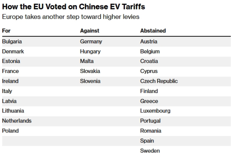 当地时间10月4日,在针对是否对中国进口电动汽车加征反补贴关税的最终投票中,欧盟成员国以10票赞成、5票反对、12票弃权,未能阻止欧委会的征税提案。而在此前推迟投票后,有消息传出欧盟在草案中新增条款,允许欧盟在法案投票表决后继续与中方就关税问题进行谈判。
