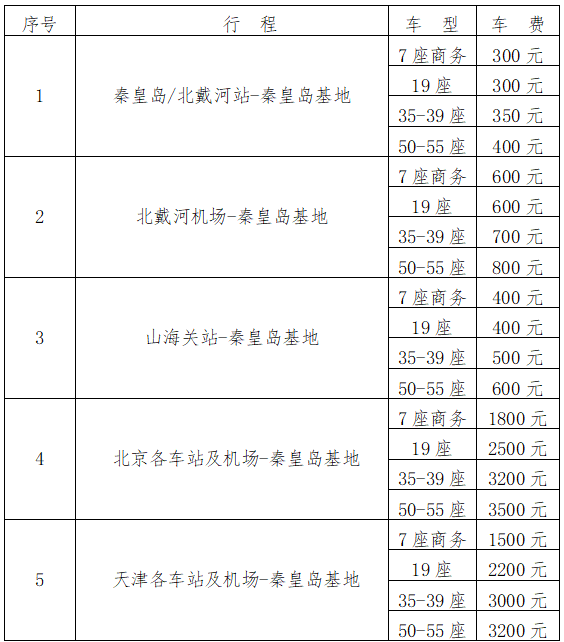 (二)大客车单程接/送站费用见下表: