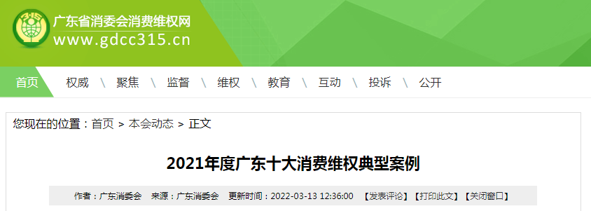 中国质量新闻网讯 2022年3月13日,广东消委会网站公布2021年度广东十大消费维权典型案例。